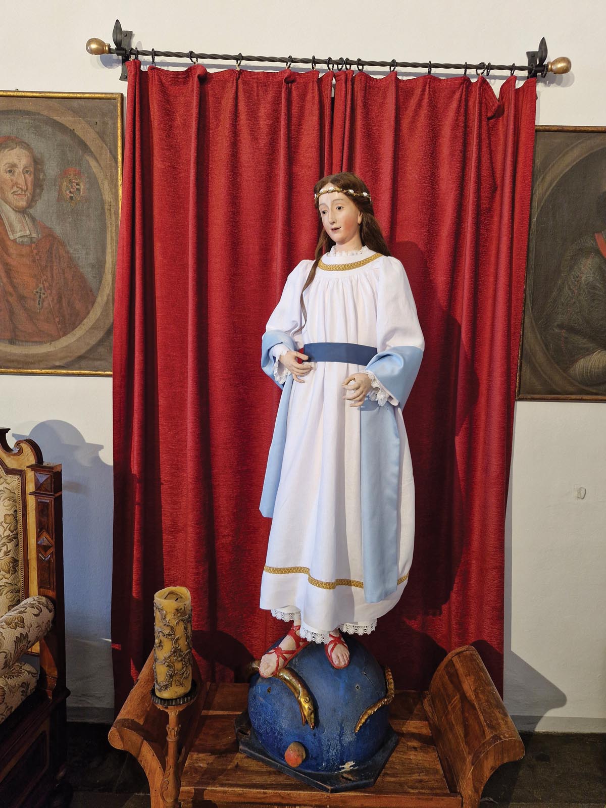 So, jetzt ist die Figur wieder angezogen und frisiert – ein Haarkranz und die Lilie für die Hand kommen noch und der Pfarrherr hat ihr im Barocksaal einen würdigen Platz gegeben. In Marienmonat Mai wird die Figur auch für alle in der Kirche zu sehen sein.