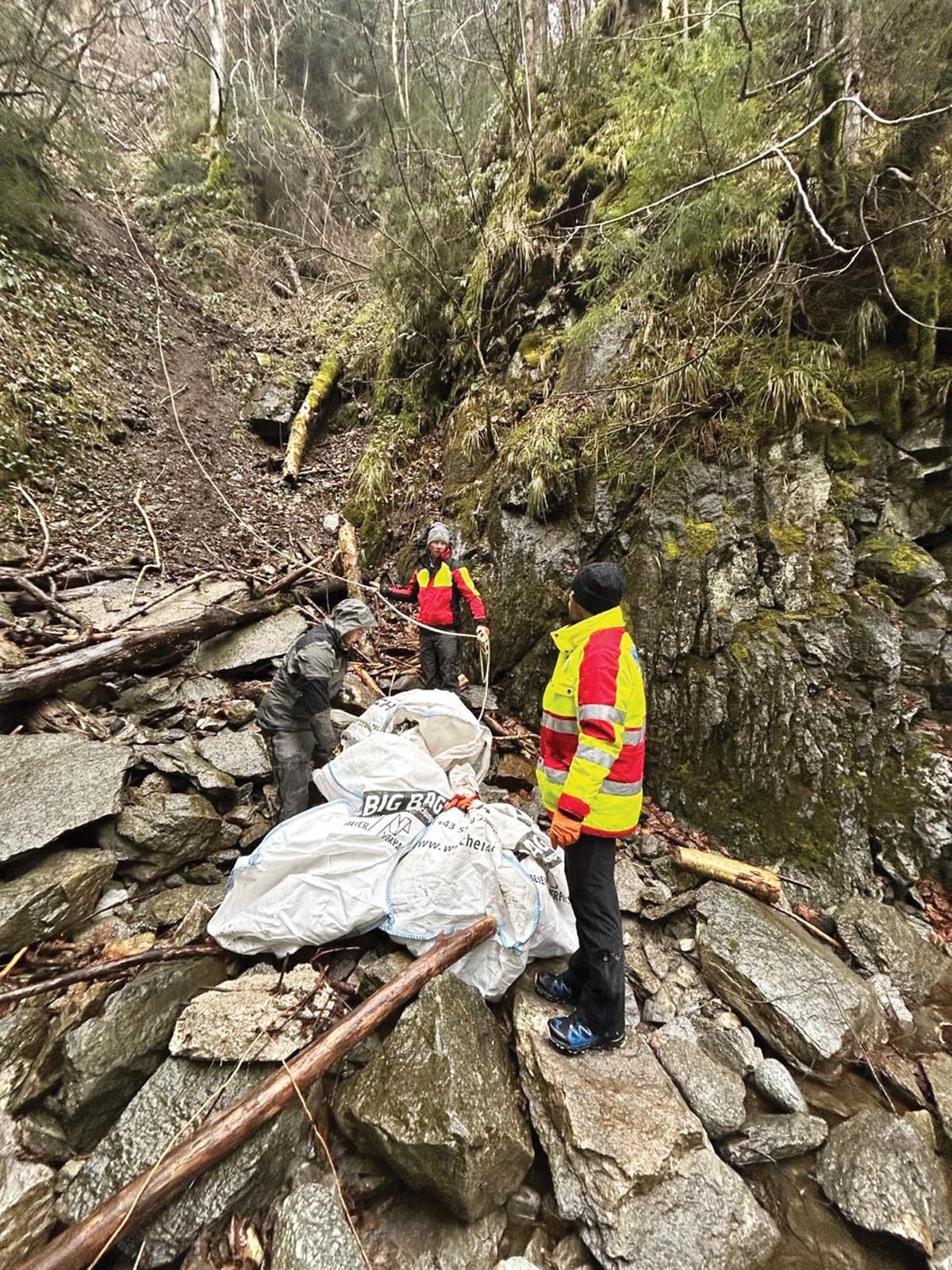 3 sogenannte Big Bags, vorwiegend gefüllt mit Hausmüll sowie Plastikmüll, Glas und Aludosen, konnten so von den insgesamt acht Einsatzkräften und zwei Arbeitern der Gemeinde Brandberg bei diesem Einsatz mittels Motorwinde und einem Traktor aus der Schlucht „geborgen“ und nach Sortierung beim Recyclinghof Mayrhofen endgültig entsorgt werden.