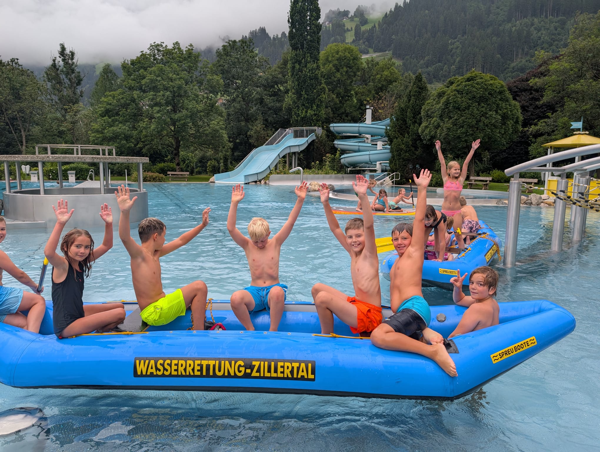 Spannende Ausflüge führten zur Erlebnissennerei und zum Auenlandspielplatz sowie ins Schwimmbad, wo die Wasserrettung die Kinder besuchte und eindrucksvoll zeigte, wie Einsätze im Wasser ablaufen – mit dabei Uschi von der Wasserrettung, unterstützt von Christine und Daniela. Beim Rutschrennen im Anschluss ging es rasant zu.