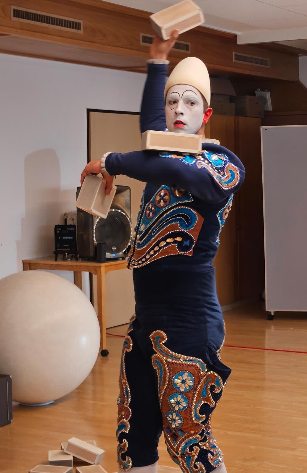 Mit seiner charakteristischen und wortlosen Art sich zu bewegen in Kombination mit Jonglage fesselte er das Publikum und schaffte eine beinahe mystische Stimmung.