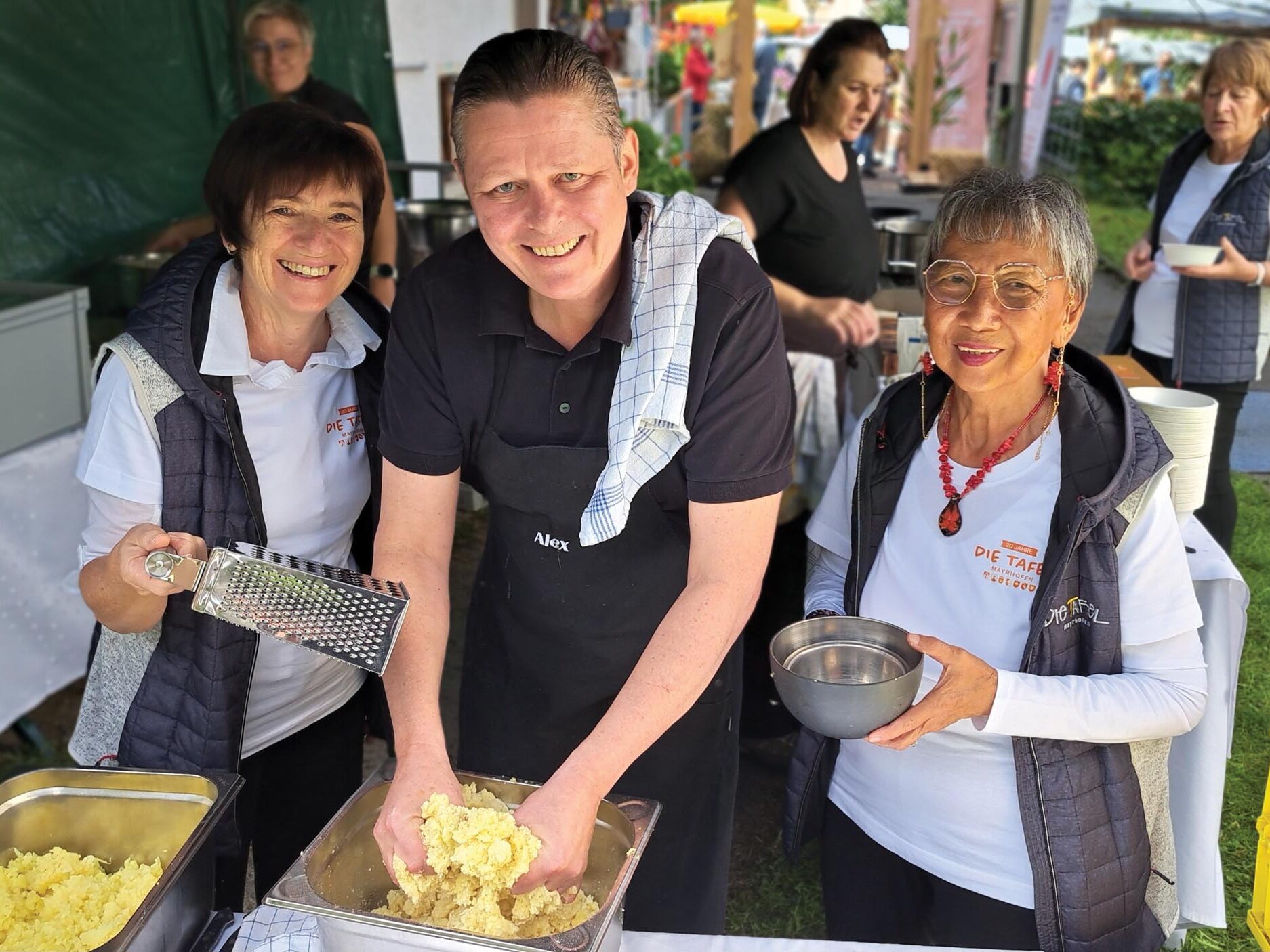 Bereits am Nachmittag herrschte im Widum Mayrhofen reges Treiben. Bei Kaffee, Kuchen und angeregten Gesprächen füllte sich der Pfarrgarten mit BesucherInnen, die die Gelegenheit nutzten, hinter die Kulissen der Tafelarbeit zu blicken. Mit viel Herzblut präsentierten die rund 40 ehrenamtlich Tätigen, die das Rückgrat der Organisation bilden, ihre Arbeit und erzählten von den Herausforderungen und schönen Momenten ihres Engagements.
