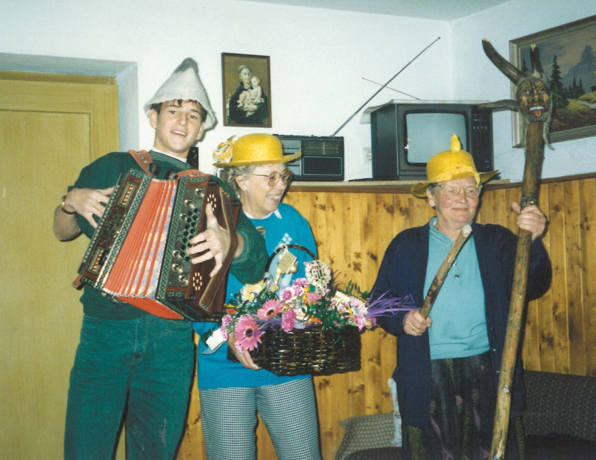 Gottfried Würcher (“Nockis”) mit Resi und Steffi aus Uderns, 1996.