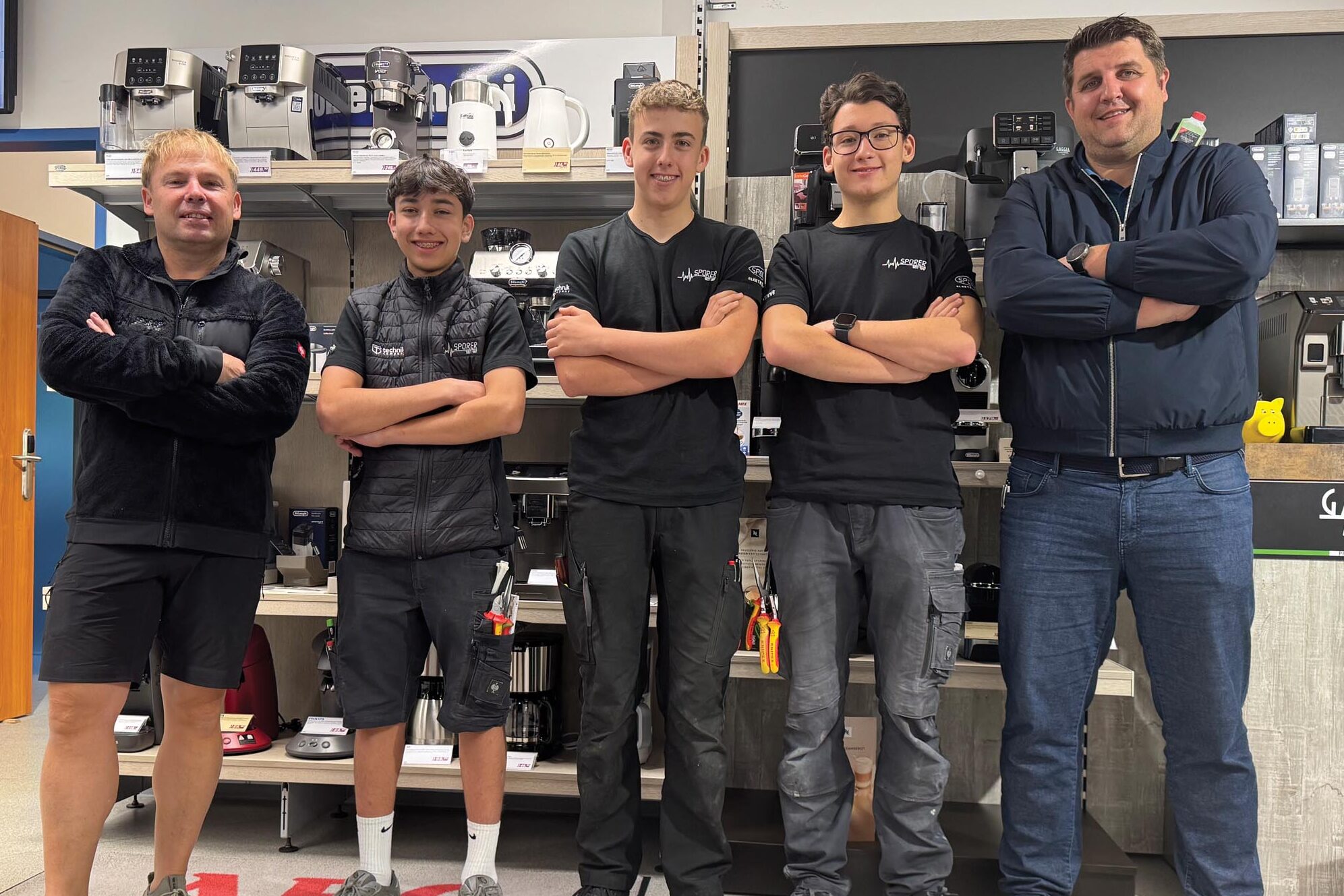Herzlich willkommen im Team: Jeffrey Shafe (l.) sowie Samuel Tavera Chavez, Daniel Kreidl und Tobias Geisler (unten im Bild mit Andreas Sporer und Thomas Fiegl).