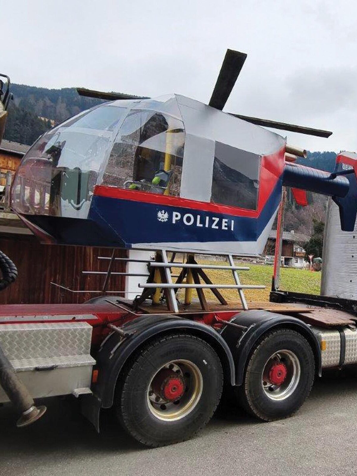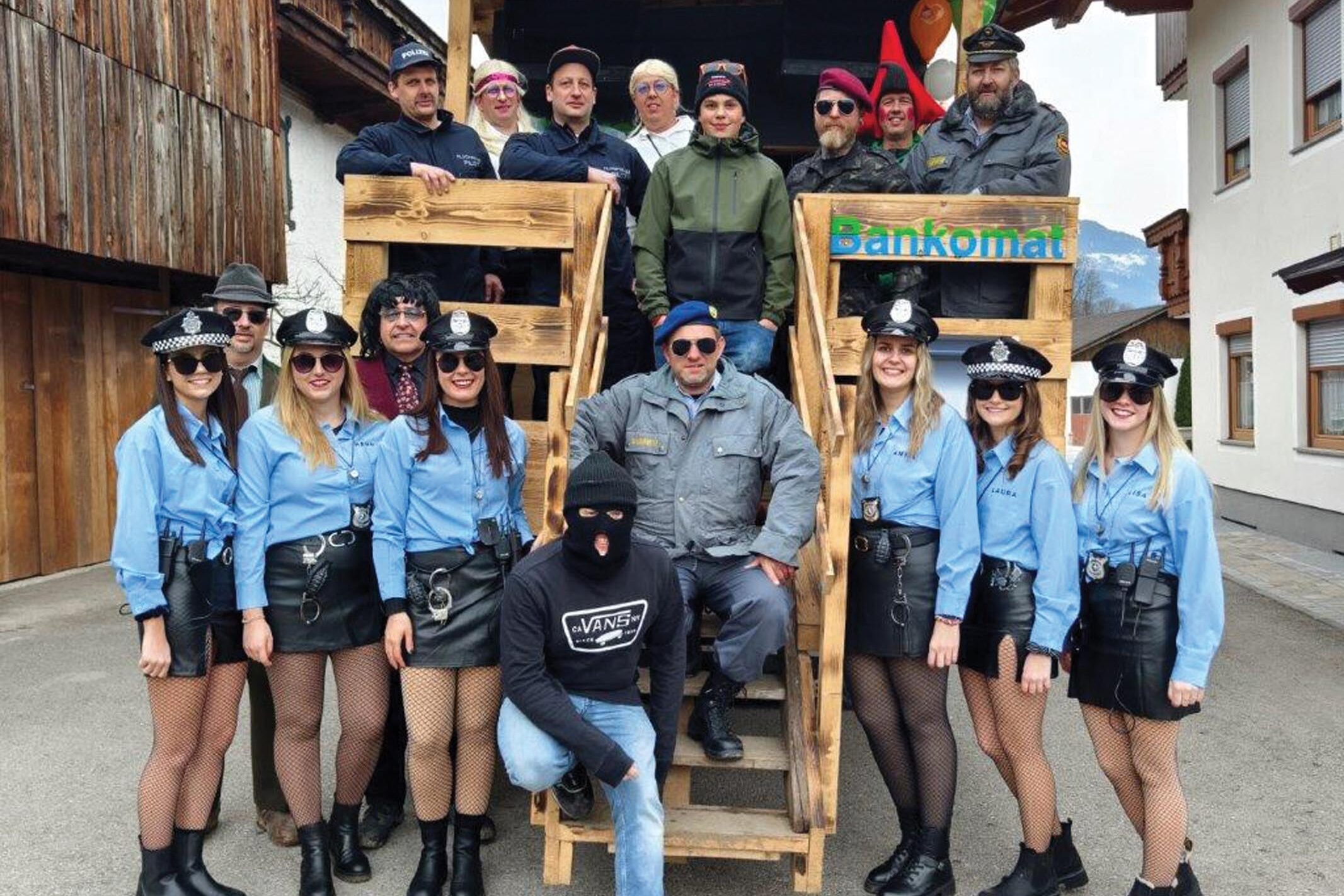 Ein besonderes Auftreten der Schützenkompanie Bruck war nach dem Piratenschiff 2024 heuer ein aufsteigender Hubschrauber bei einer Suche nach einem Bankräuber. Die Faschingsnarren der Schützenkompanie arbeiteten tagelang und wochenlang an der Herstellung des Hubschraubers und des Wagens.